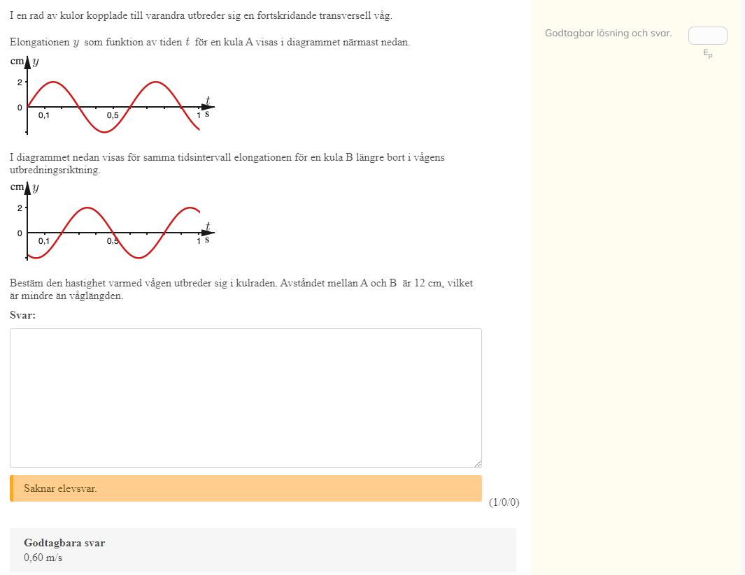 I graferna kan jag se att en periodtid är T=0.6 s. Sedan för att beräkna hastigheten används v=våglängd/periodtid. Våglängden försökte jag beräkna genom att inse att anvståndet mellan A och B motsvarar 1/4 landa eftersom A börjar i jämviktsläget och B börjar vid nedre läget. Då får jag 0,48/0,6=0,8 m/s men det är fel. Vart har jag tänkt fel?