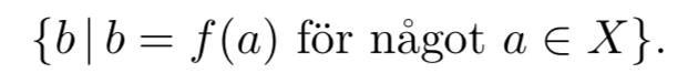 "Mängden av alla b sådana att b är lika med funktionen av a, för något a som tillhör mängden X"