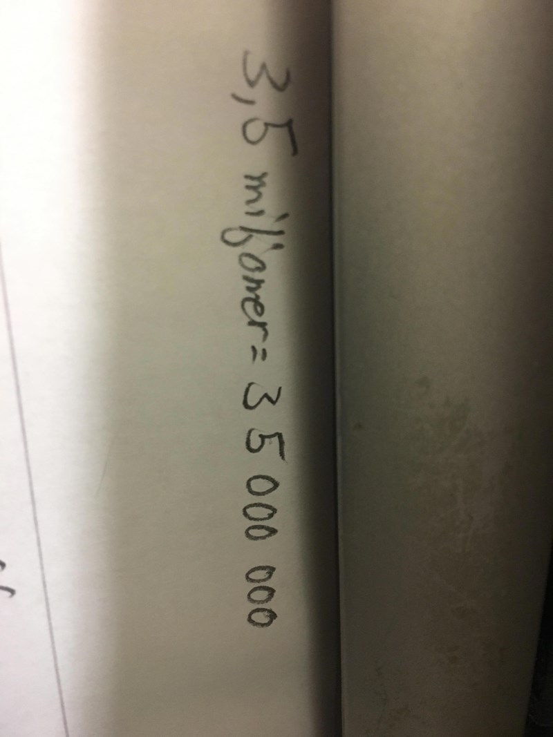 Hej, är det så man skriver 3,5 miljoner i siffror och kan ni sedan ge mig olika tex miljoner, tusen, miljard osv i nummer så att jag kan skriva i siffror typ 2,4 biljoner osv för är förvirrad för sånt och förstår inte riktigt!