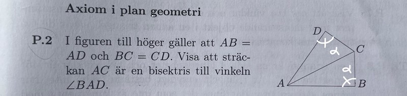 Hej. Jag är lite förvirrad angående kongruensfall SVS då jag försökt lösa denna uppgiften på några sätt. Min tanke var att eftersom sida AB=AD och BC=CD så borde man kunna säga att vinkeln alfa jag ritat ut är lika stor? Eller är det fel att tänka att mellanliggande vinkel på två sidor i två trianglar medför samma vinkel? Har inte kommit längre på uppgiften än att också konstatera att trianglarna är kongruenta enligt SSS också så medför väl det att alla sidor har samma vinkel? För att bevisa att det är en bisektris så behöver jag visa att bisektrisen delar triangelspetsen i två vinklar som är lika stora.
