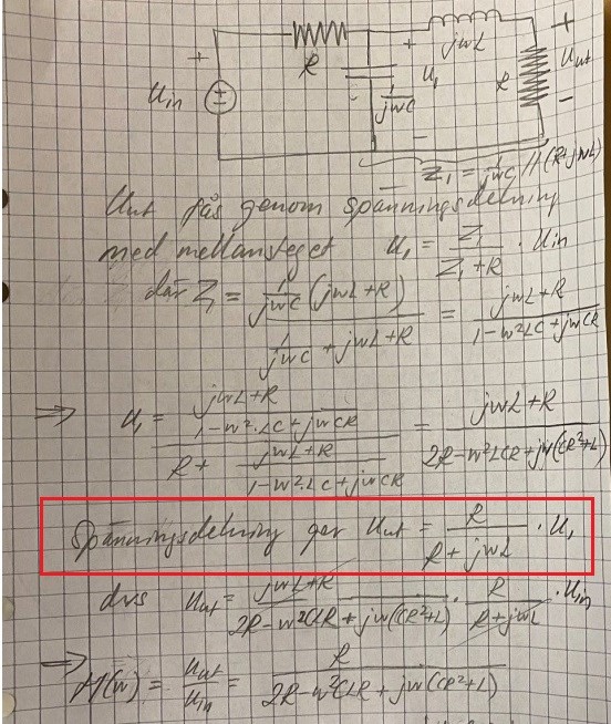 Kruxet är i samband med att ta fram överföringsfunktionen, u_ut/u_in. Varvid jag inte misslyckas med att få fram den, vilket ledde mig till att kika på facit och jag förstår inte riktigt ett steg i facitet, se röd ruta.