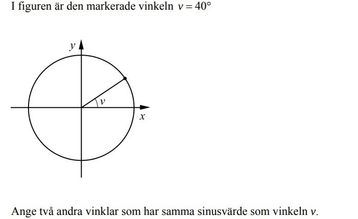 Du får även en till vinkel som är eller om du vill använda grader 180-v. Rita in det i din enhetscirkel.