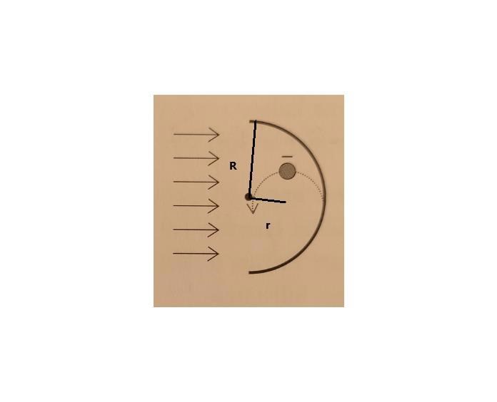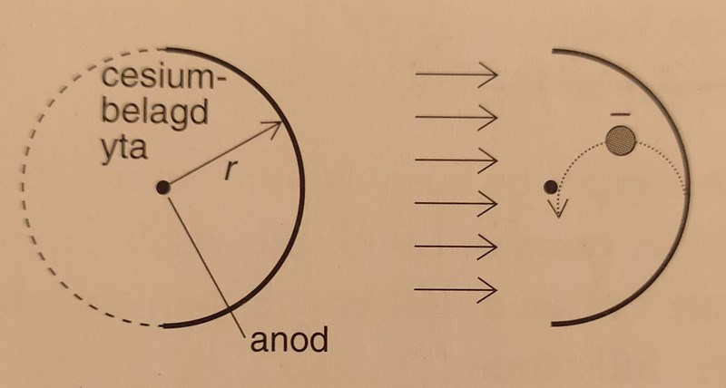 Då blir elektronens nödvändiga ban-radie, hälften av fotocellens cylinder-radie. Eller hur?