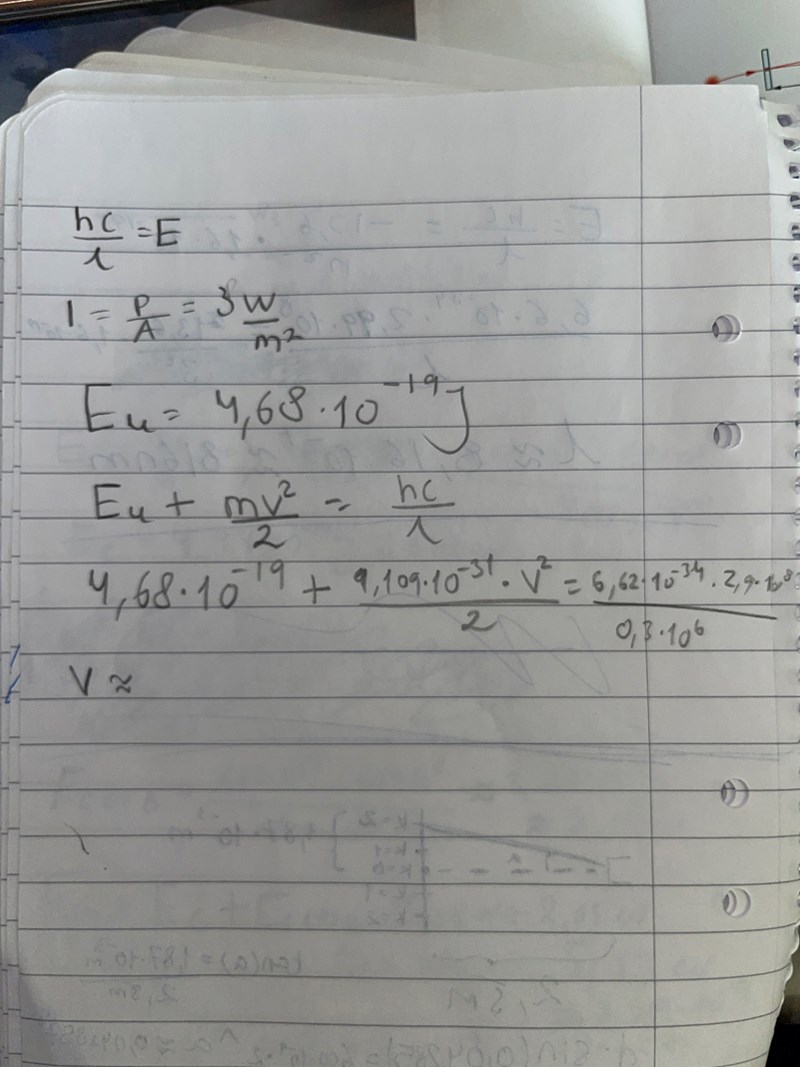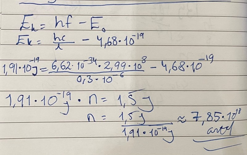 Anta att ljus med våglängden 0,3*10^(-6) m infaller med en intensitet av 3W/m^2 och att sannolikheten för att en foton ger fotoeffekt är 0,5. Utträdesarbetet är ca 4,68 * 10^-19 J. Beräkna hur många elektroner som frigörs per sekund och meter.