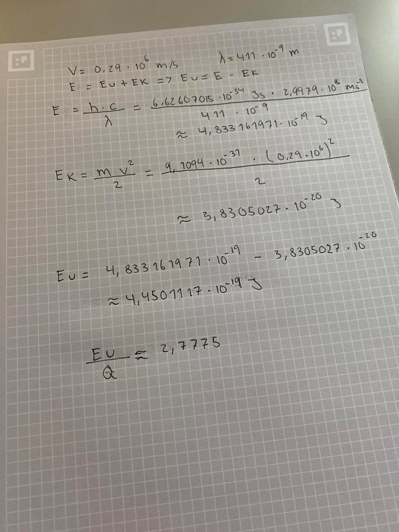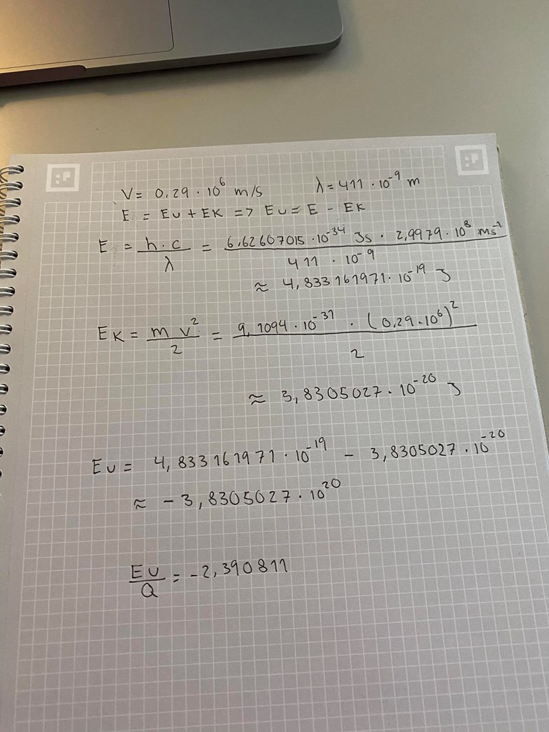 Något gick fel med subtraktionen. Du fick värdet för minus kinetisk energi igen (-3,83.10-20 J), fast med positiv exponent.