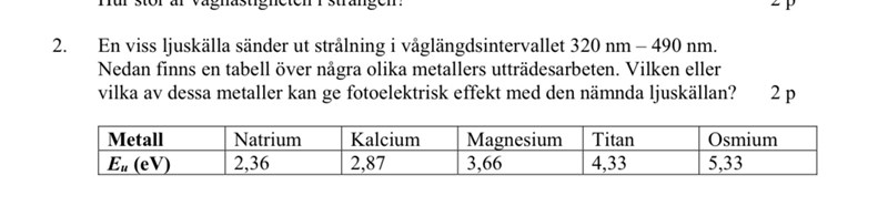 Hej! Jag fick svaret till att magnesium och kalcium ger fotoelektrisk effekt men facit säger även att natrium gör det. Våglängden för natrium ligger inte mellan 320nm-490nm dock. Hur kommer detta sig?
