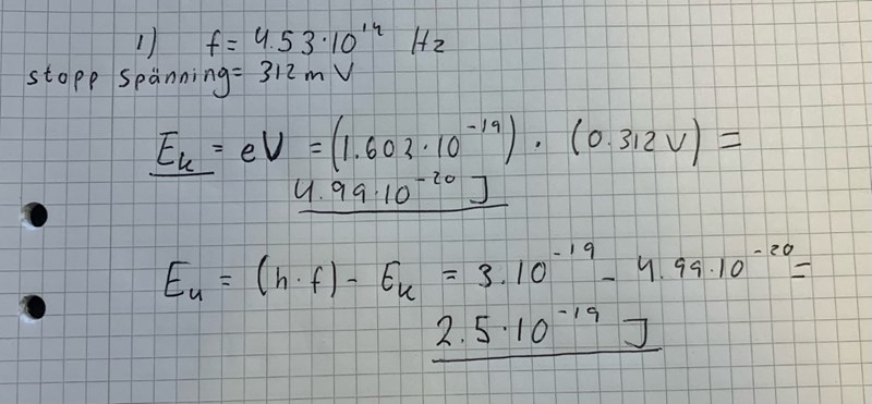 Är dessa svar rätt? Finns inget facit för uppgiften... man skulle hitta rörelseenergin hos en elektron och sedan uträdesenergin för elektronen.