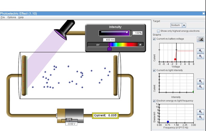 Hej, hade ett par frågor angående fotoelektriska effekten och följande graf (Current vs battery voltage) i simuleringen. Mina frågor är: Kan någon förklara för mig vad denna grafen visar? och Varför flyter det en ström trots att spänningen är negativ? och Varför når strömmen ett maxvärde trots att spänningen ökar?