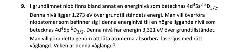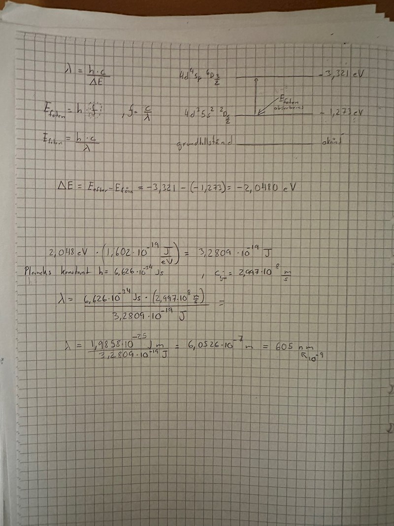 Man har två olika energinivåer, där energin går att omvandla till Joule, och sedan beräknas skillnaden för att få ΔE?