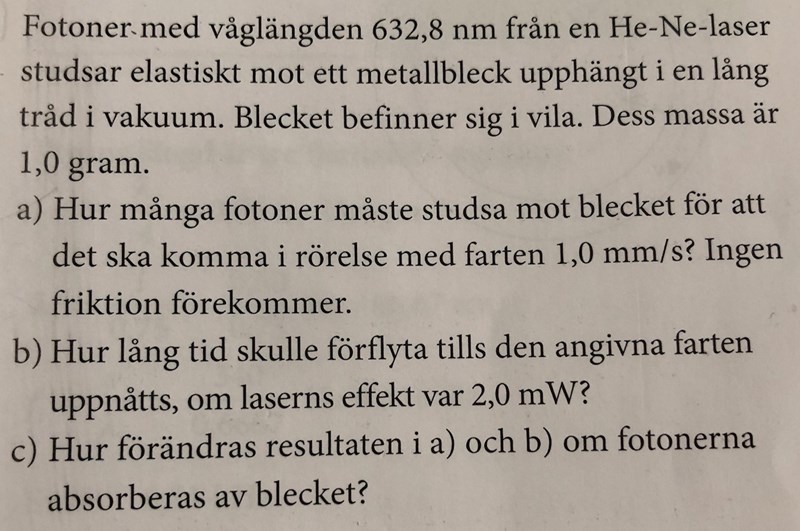 Svaret stämmer överens med facit, men jag tycker att det är konstigt att jag använder v=10^-3 m/s när jag räknar fotonens energi. Den borde väl ha samma hastighet som ljuset?