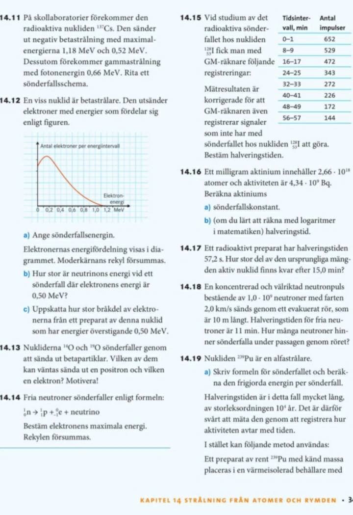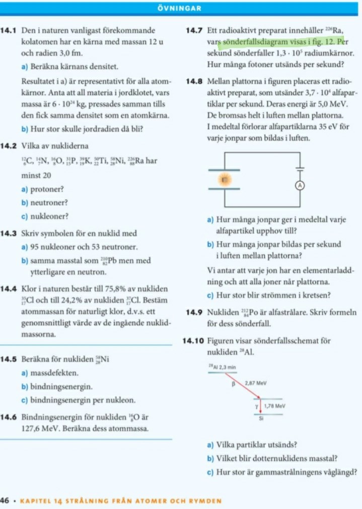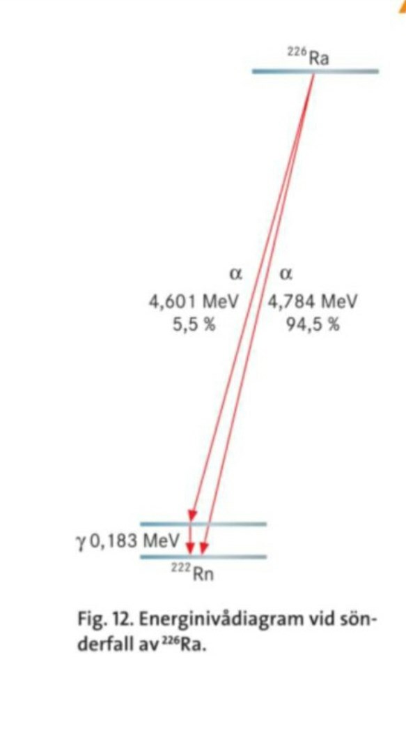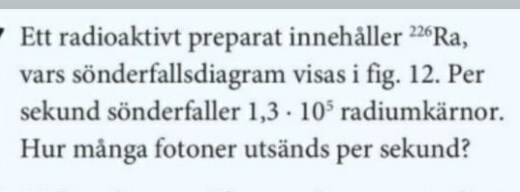 Det framgår även hur stor andel av 226Ra sönderfallen som resulterar i de två olika typerna av alfasönderfall. Från detta, och den angivna sönderfallsaktiviteten i uppgiften kan du beräkna hur många fotoner som sänds ut.