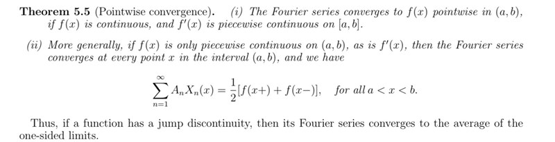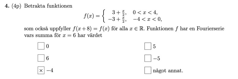 PATENTERAMERA skrev:Du behöver inte räkna ut serien. Det finns satser för den punktvisa konvergensen av fourierserien av en styckvis kontinuerlig funktion. Kolla upp i lärobok.