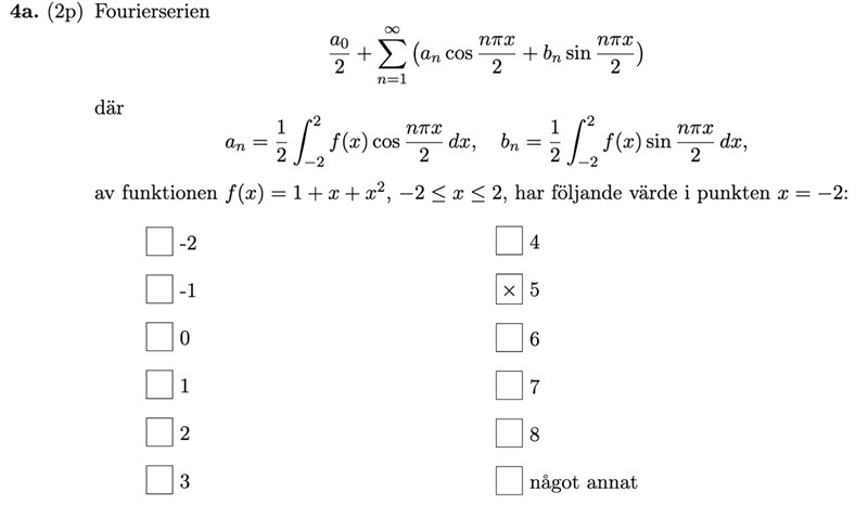 D4NIEL skrev:Fourierserien som den är skriven har vinkelargumenten där och innehåller såväl - som -temer integrerade över intervallet till . Det innebär att Fourierserien är periodisk, dvs har perioden 4.