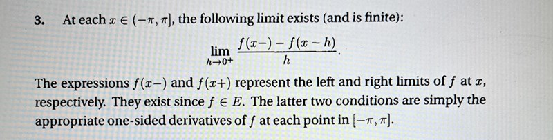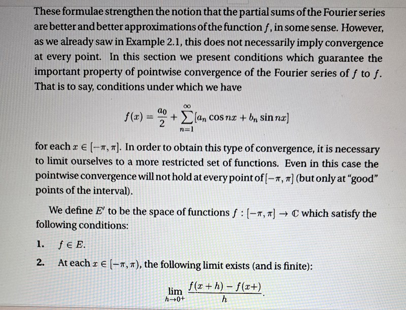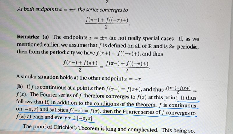 Satsen säger att serien konvergerar mot f(x) för alla x i intervallet -pi till pi. Dvs s(pi) = f(pi). Se det som jag strukit under i boken.
