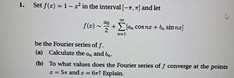 Obs det hela går ut på att beräkna vilket värde som Fourierserien s(x) konvergerar mot då x = 5pi. Vi vill således beräkna s(5pi). Vi utnyttjar då att s är periodisk och inser att s(5pi) = s(pi). Sedan utnyttjar vi satsen i boken som säger att s(pi) = f(pi).