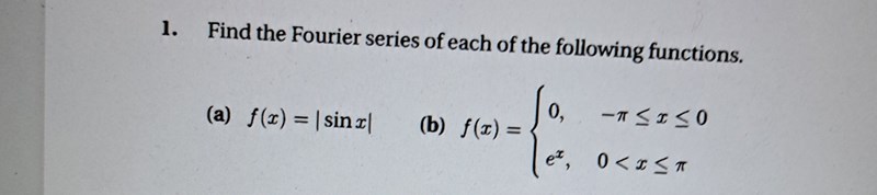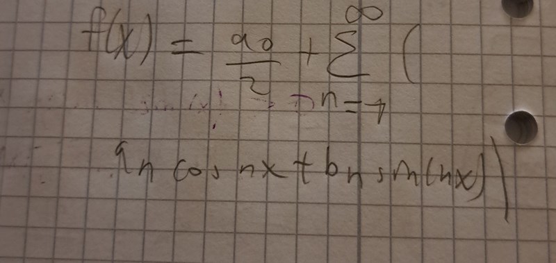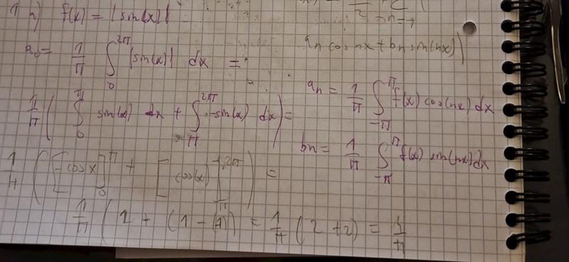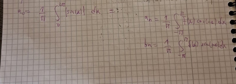 Nej men |sinx|={sinx , x€[0,pi] , -sinx , x€[pi,2pi]}. Ska integralgränserna vara då från -pi till pi för a_n ,a_0 och a_b?