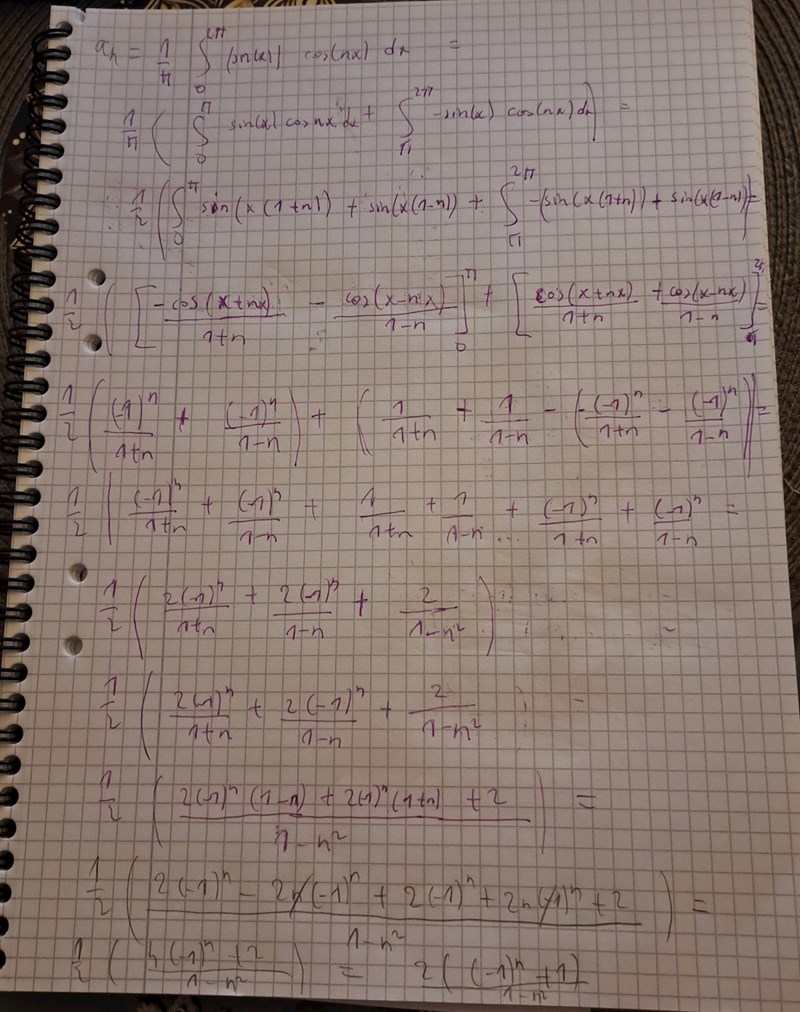 Facit fick ut samma svar men de bytte plats på nämnaren på a_n och sen har de fått ett minustecken. Varför gör de så? Ska man göra det? Sen undrar jag också varför a_1=0 när mitt a_0 är 4/pi ?