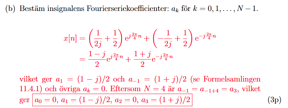 Hallå, behöver lite hjälp med uppgift b. Ska uttrycka Fourierkoefficienterna för k=0,1,...,N-1 där N=4 (obs stämmer enligt facit) så för k=0,1,2,3. Jag får endast värde för k=1 och inte för k=3 enligt facit. Förstår inte varför a-1=a3. Hänvisar till min lösning och facit nedan.