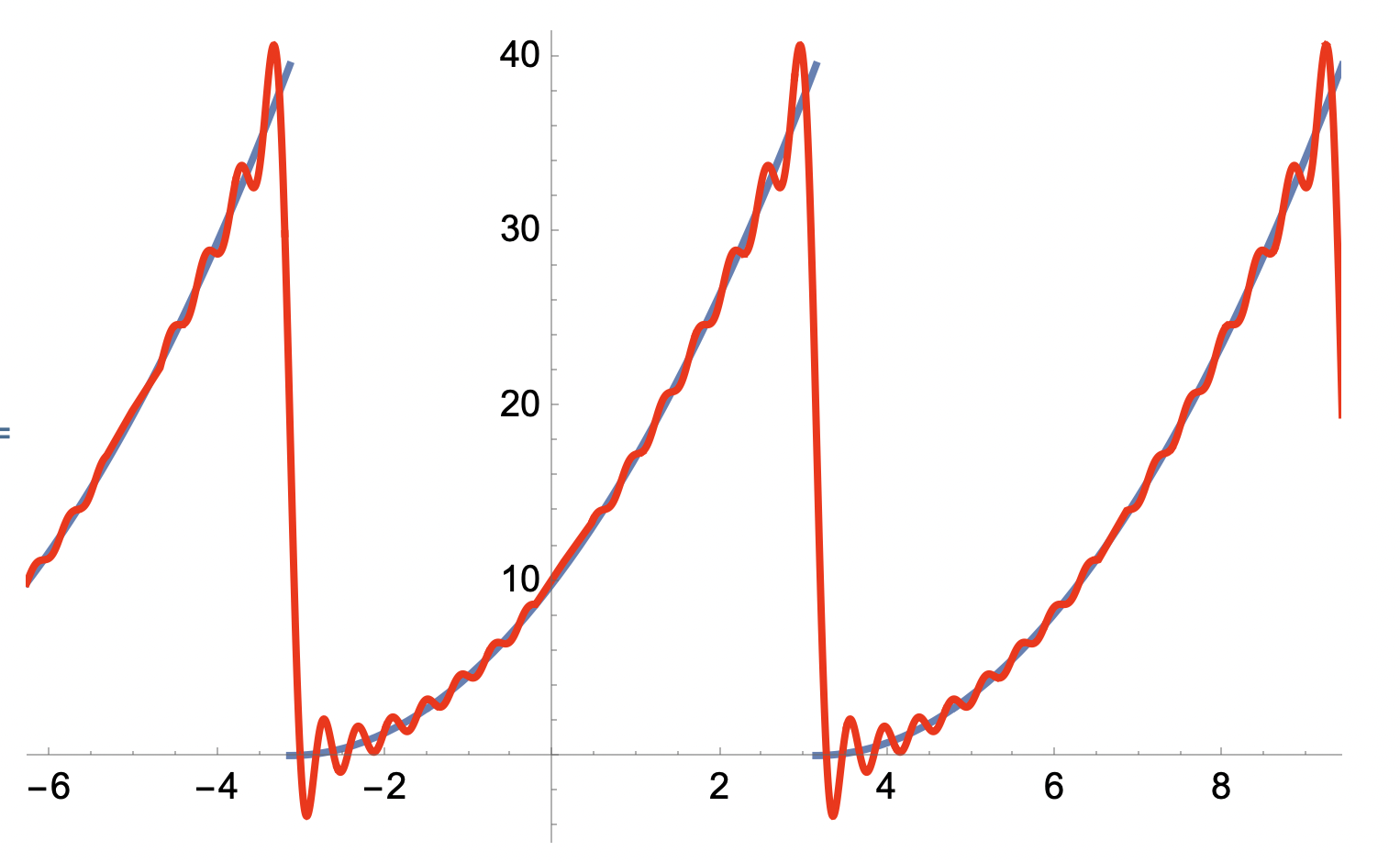 Hej, har svårt att förstå delen där man ska rita grafen för Fourierseriens summa på intervallet [−2π, 3π]. Det jag har svårt att förstå är varför det är ihåligt i figuren där tex x = π. resp -π.? Enligt konvergenssatsen ska ju Fourierserien F(a) konvergera mot f(a) om f(x) är kontinuerlig i punkten x = π.. Alltså om x = π., där f(x) är kontinuerlig eftersom f(x) är definierad på intervallet −π ≤ x ≤ π. , så borde ju F(π.) konvergera mot f(π.) = 4π.2, men istället ör det ihåligt där, med en fetmarkerad punkt någon annastans.