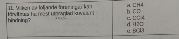 mag1 skrev:Lite knepigt att tolka frågan tycker jag. "mest utpräglad" tolkar jag som att det är en jämförelse mellan bindningarna i de olika ämnena, men med vad du skall jämföra med får vi nog lista ut.