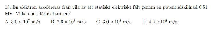 Enligt mina ovanstående beräkningar bör den ha en hastighet (4/3)*10^8,5m/s som blir ungefär 4*10^8 vilket lurade mig till svar D. Detta är över ljusets hastiget och måste vara fel.
