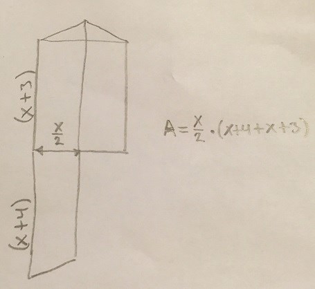 1) Höjden på triangeln är det blir när vi tar bort parenteserna.2) Sedan hade jag ju glömt att vi måste multiplicera med x, då behövde vi en parentes runt hela uttrycket.