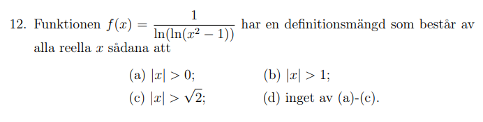 Testar jag sqrt(2) i (1), så ges 1 i parentesen vilket ger 0 efter man tagit ln. Detta går såklart inte. Men C alternativet säger att absolutbeloppet x ska vara STÖRRE än sqrt(2). Så alla tal större än sqrt(2) ger ÅTMINSTONE något i stil med 1,0001 eller mer (istället för 1 som exakt sqrt(2) gav). Så sista parentesen blir ej noll. Så jag valde C, men rätt svar är d.
