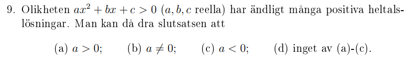 Jag fattar att en x^2 graf har oändligt många x-värden höger och vänster om sina nollställen som är lösningar, vilket isåfall får mig att peka mot att a bör vara negativt eftersom det bara finns ett visst antal lösningar som är ovanför x-axeln och därmed ändligt. Å andra sidan så häromdagen gjorde jag i mitt förra inlägg på fråga 7 (2023), så fann jag att det fanns oändligt många lösningar inom ett intervall. Alltså samma sak, varför är det skillnad? KANSKE beror det på att i denna uppgift vill de ha HELTALSLÖSNINGAR, medan de i uppgift 7 kunde verkar kunna ha vilket svar som helst, alltså även decimaltal etc så därför räknas det som oändligt istället för ändligt.