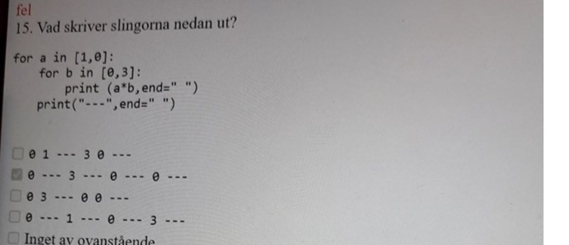 for a in [1]: for b in [0, 3]: print(a * b)Svaret