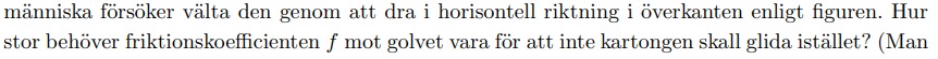 Jag redigerade min fråga lite som du kanske såg. I alla fall fråga 16: Hur stor behöver friktionskoefficienten f mot golvet vara för att inte kartongen skall glida istället?