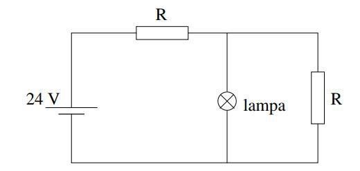 En glödlampa utveclar effekten 12 W när den kopplas direkt till ett batteri med spänningen 6V. En person har bara tillgång till ett batteri på 24V, och försöker koppla in motstånd enligt figuren för att inte lampan skall gå sönder. Hur stor skall resistansen R hos mostånden vara för att spänningen över lampan skall vara 6V?