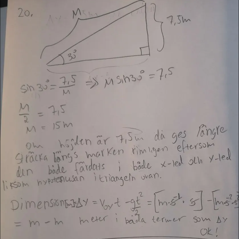 Jag tänkte att jag hade fått till en snygg lösning även på denna 5p uppgift, men icke enligt facit. Rätt svar verkar vara 27 m. Deras lösning är algebraisk o lite krånglig enligt mig, nedan ser ni min lösning där jag ritat och motiverat skriftligt. Var går jag fel i min lösning, fungerar inte min metod?