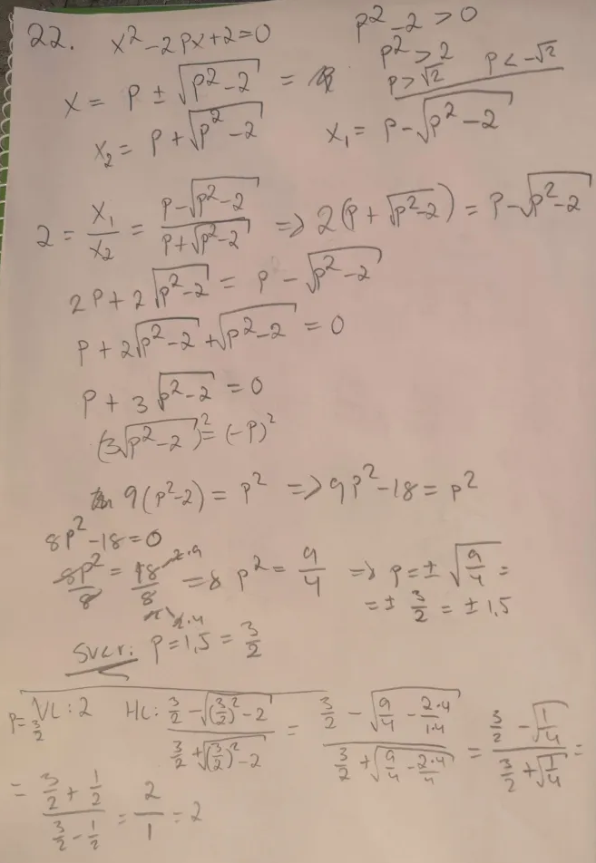 Okej, din metod är ju en annan än min och utifrån att jag inte vet svaret. Så hade jag gärna velat veta vad som är fel i det jag gjorde. Jag ser att du använt Vietas formler och det är en sak jag funderat på, när ska jag använda dem? I detta specifika fall ser jag ju att enligt ena regeln x1+x2=2p, att p måste vara negativt då x1 och x2 är negativa och därav kan p=3/2 ej vara rätt. Är det kanske det som Vietas formler är till för, kontrollera beräkningarna.