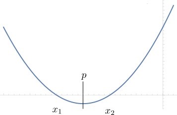 Tänk på att är en "glad mun"-kurva med en symmetrilinje vid . För att få till två reella rötter måste den glada munnen ligga så att funktionen har två nollställen.
