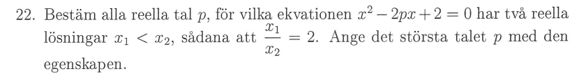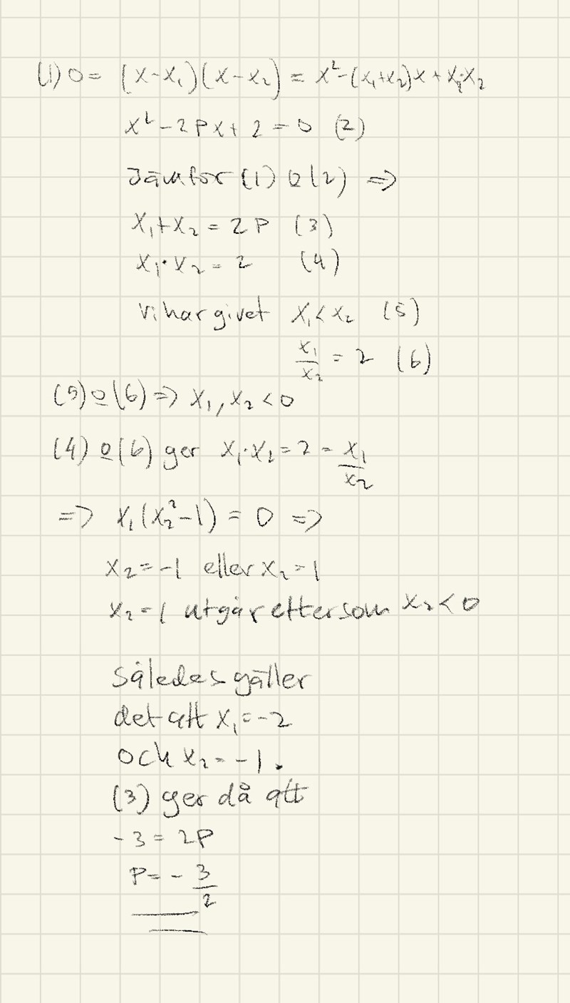 Okej, din metod är ju en annan än min och utifrån att jag inte vet svaret. Så hade jag gärna velat veta vad som är fel i det jag gjorde. Jag ser att du använt Vietas formler och det är en sak jag funderat på, när ska jag använda dem? I detta specifika fall ser jag ju att enligt ena regeln x1+x2=2p, att p måste vara negativt då x1 och x2 är negativa och därav kan p=3/2 ej vara rätt. Är det kanske det som Vietas formler är till för, kontrollera beräkningarna.