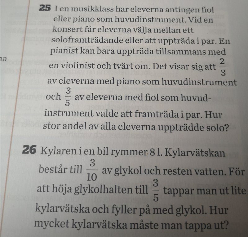 Angående fråga 25, hur har du börjat? Kalla antalet studenter x. Antalet studenter som valt piano kan vi kalla för p, och antalet stadenter som valt fiol kan vi kalla för f. Hur många studenter som har valt piano ville uppträda i par? Hur många pianostudenter ville inte uppträda i par? Hur ser det ut för fiolstudenterna? :)