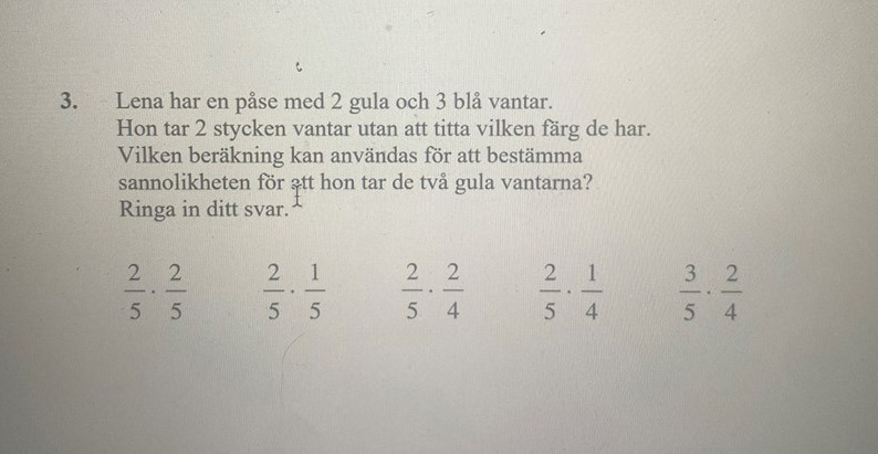 Det stämmer bra. Om hon nu redan plockat upp en gul vante och ska plocka upp en vante till, hur stor är sannolikheten att den är gul? Det finns alltså en gul och tre blåa vantar kvar.