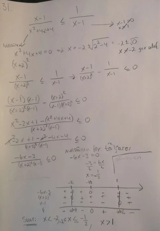 Jag har räknat enligt nedan, men enligt facit är detta ej rätt. Förstår ej hur, ser att i facits beräkning så har de fått en annan täljare än den jag fick. Ser ni något fel i det jag räknat? Och sen undrar jag om man i sitt intervall ska inkludera "oändligheten", tex att jag skriver -oändlighet<x<-2 istället för bara x<-2. För jag har alltid skrivit det senare alternativet, men märkte att facit gör det första alternativet.