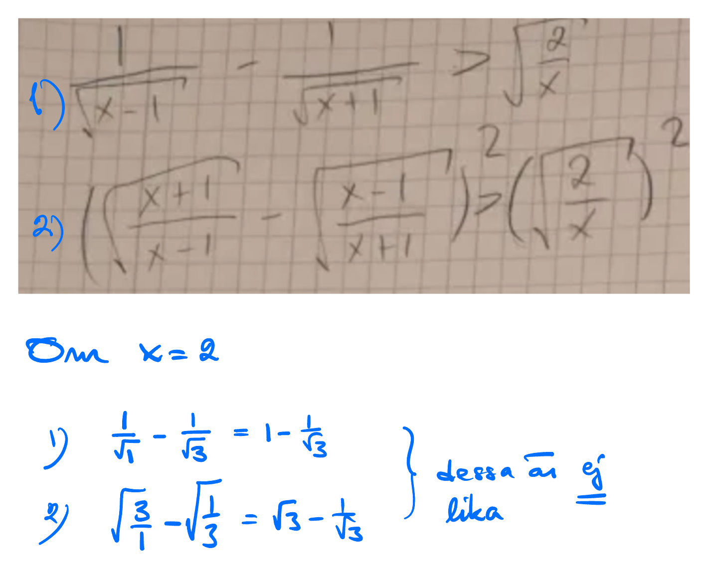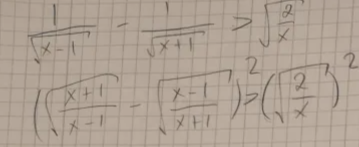 Ja tror det. Om vi lägger x=2 och utvecklar parentesen med ^2, så ges 3-2sqrt(3/3)+(1/3)=3+(1/3)-2=(9/3)+(1/3)-(6/3)=(10/3)-(6/3)=4/3 vilket är större än HL som är 2/2=1=3/3
