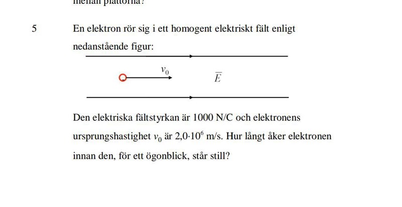 Jag fick ut Vad kraften är med hjälp av E =F /Q sen fick jag veta vad accelerationen är med hjälp av F =ma, efter detta så försökte jag ta reda på tiden men får typ 1,13725*10^-8 när jag använder formel a =v/t så det blir fel svar till slut när jag senare ska stoppa in i det för att ta reda på sträckan ur formel s =v0t+at^2/2