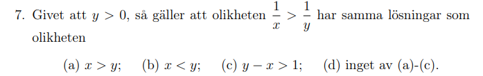 Jag tänker att om y är positiv så kan vi multiplicera båda sidor med y utan att behöva vända tecken. Det ger att y/x>1. Om y är positiv då måste också x vara det, eftersom ettan annars hade haft annat tecken. Och att kvoten är större än 1 indikerar på att y>x. Därför svarade jag b. Men detta är fel. Rätt svar är D. Var tänker jag fel?
