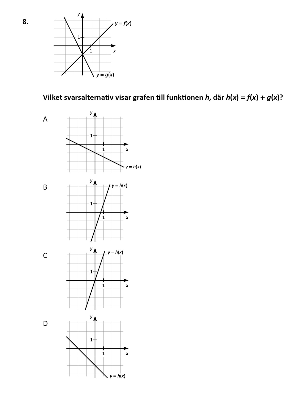 MrPotatohead skrev:Om man är snabb på tolka k-värden ser man även att g lutar -2 och f lutar 1. h måste då luta -1 vilket endast D gör.