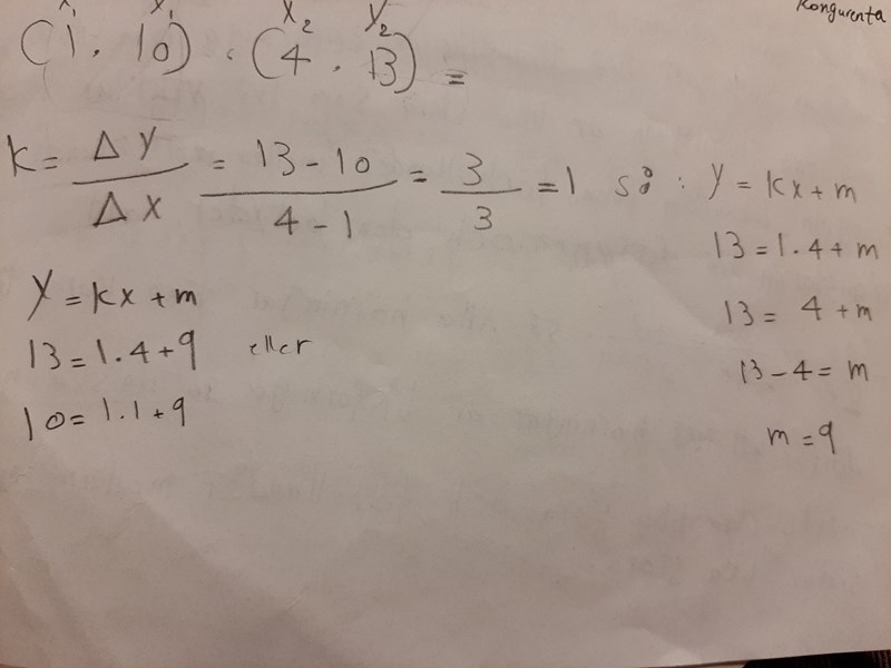 Gör en tabell med x och y och för in värdena. sen borde den kunna ge dig en "y=kx+m"-formel.