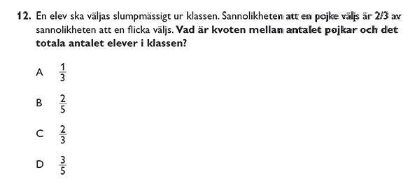 Vi kan kalla sannolikheten att en flicka väljs för t. Sannolikheten för att en pojke väljs måste då vara . Summan av dessa sannolikheter är ett, vilket ger oss ekvationen . Sannolikheten att en pojke väljs är alltså 2/5, och eftersom urvalet sker slumpmässigt måste andelen pojkar i klassen vara just 2/5. :)
