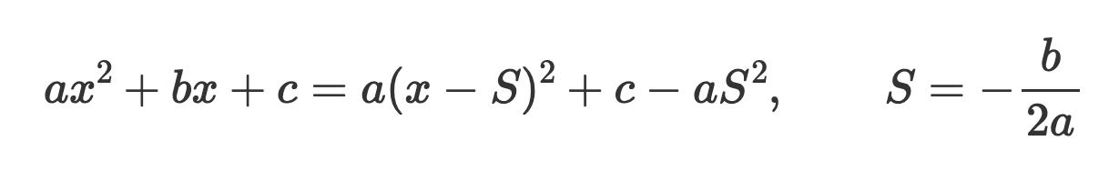 vilket ger att symmetrilinjen är x=S och vertex är (S,c-aS^2) samt skärning med x-axeln för