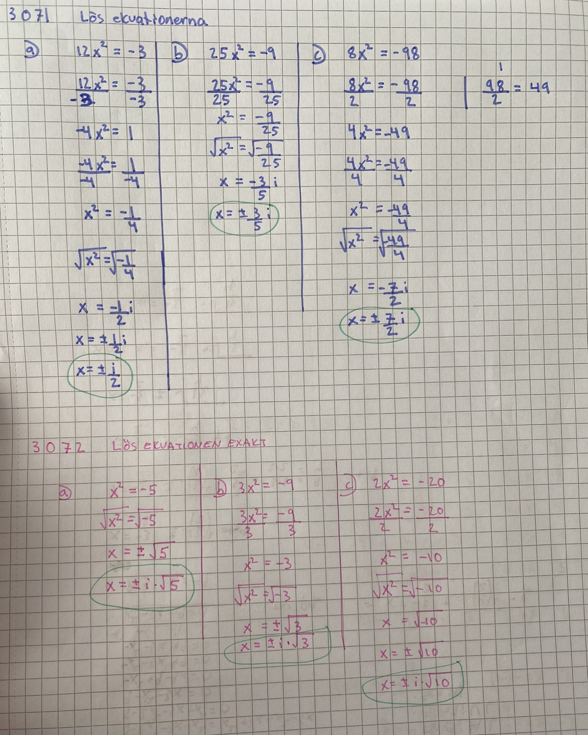 vad är skillnaden med att ha i bakom siffran som i de blå uppgifterna / framför rottecknet som i de rosa uppgifterna. Det jag egentligen ville svara med i rosa var x = +/- roten ur sen den siffran. Men facit säger att man ska svara x= +/- i roten ur sen siffran. Vad menas de svaret? Jag förstår vad det blåa betyder exempelvis 7/2i = 7/2 gånger i dvs 7/2 * -1. Men svaret till rosa vet jag inte riktigt vad som menas, även fast jag kan typ räkna fram det.