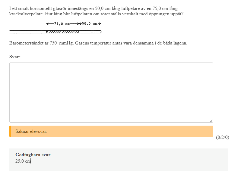 Trycket från början är väl 750 mm Hg. När den sedan vänds uppåt kommer även kvicksilvret att trycka ned med 7,5 mm Hg. Vet ej hur jag ska fortsätta.