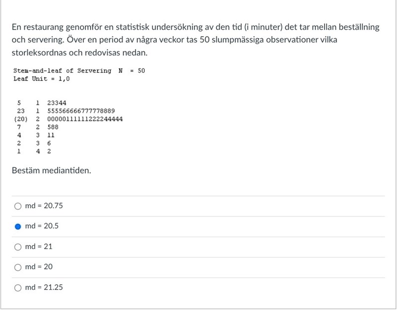 Jag tänkte n+1/2 alltså värde 25.5 är där medianen ska vara, medianen finner jag på rad tre efter två nollor, men jag förstår inte hur jag ska tänka därefter. Eftersom det är 5 nollor och vi är efter den andra så ska det bli 20 komma något?