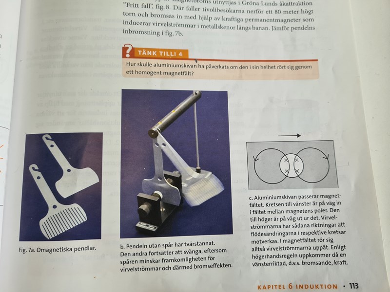 När pendeln svänger in i fältet, induceras en ström moturs. Detta för att mägnetflödet minskas, och enligt Lenz lag vill den förbli detsamma. Det inducerade flödet blir riktat ut ur pappret. Högerhandsregeln lyder då att en kraft riktas åt vänster. Sålunda bromsas pendeln in till en vis grad.