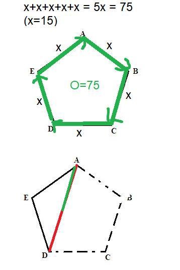 Eftersom femhörningens omkrets är 75 cm så är varje sida 75/5 = 15 cm.